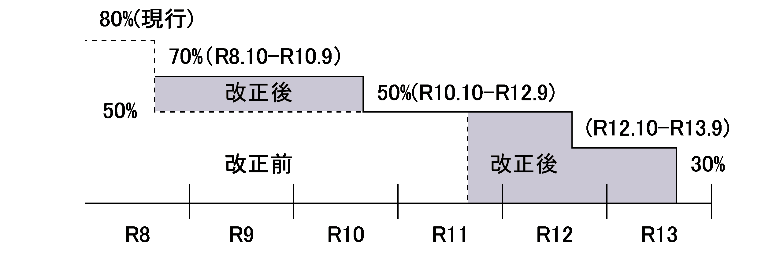 元々、令和8年10月に50%、令和11年10月で控除なし、となる予定でしたが、新たに70%と30%の期間を新設し、期限も最終的に令和13年9月まで延期されることになりました。